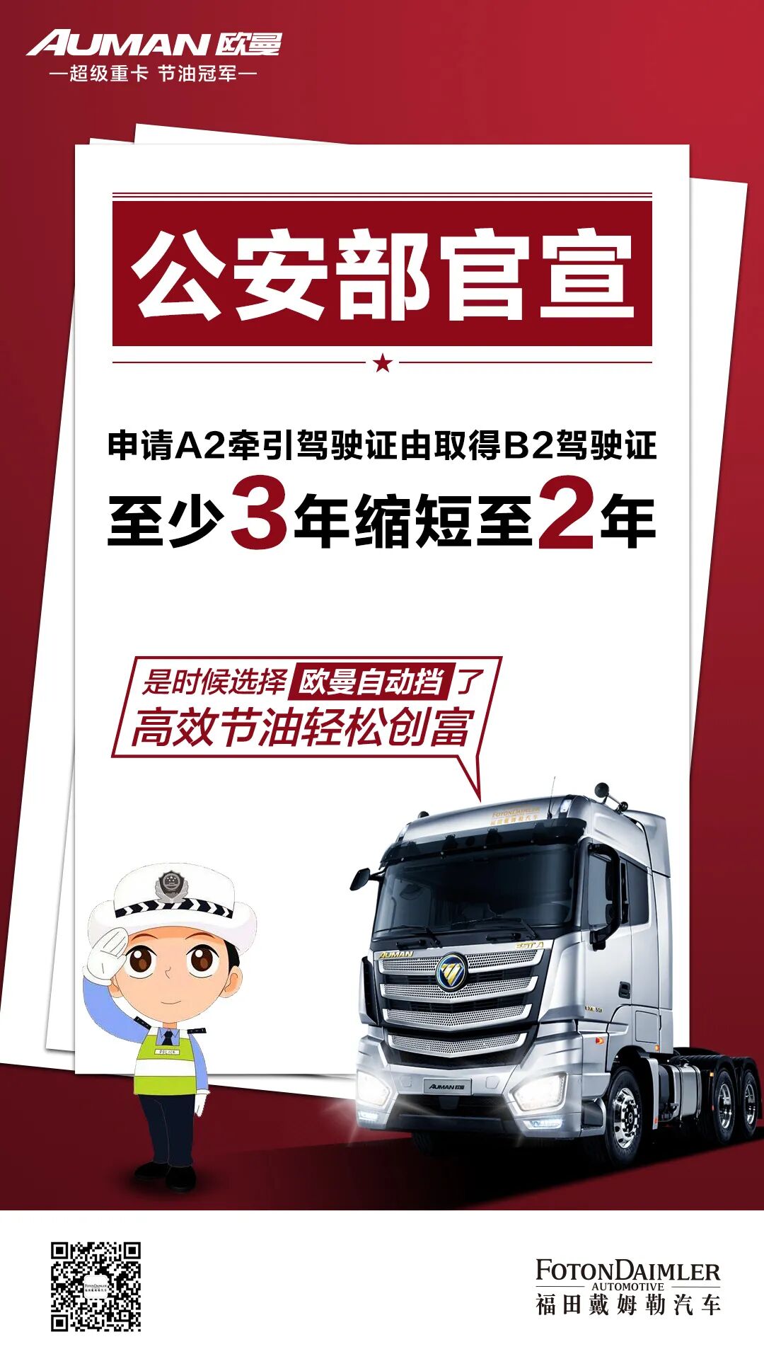 总的来说,本次政策修改对卡车行业是一个利好,也是一个买车、换车的良机,不管你是准备考证、升级的新手司机,还是准备在多奋斗几年的老司机,是时候为自己换上一辆智能、舒适、节油、高效的欧曼自动挡超级重卡了。