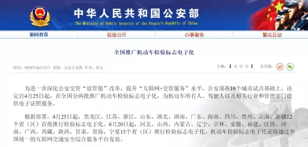 近日,公安部发布了一份关于全国推广机动车检测标志电子化的声明,其中标明了关于全面推行机动车检测标签电子化的时间和省市。