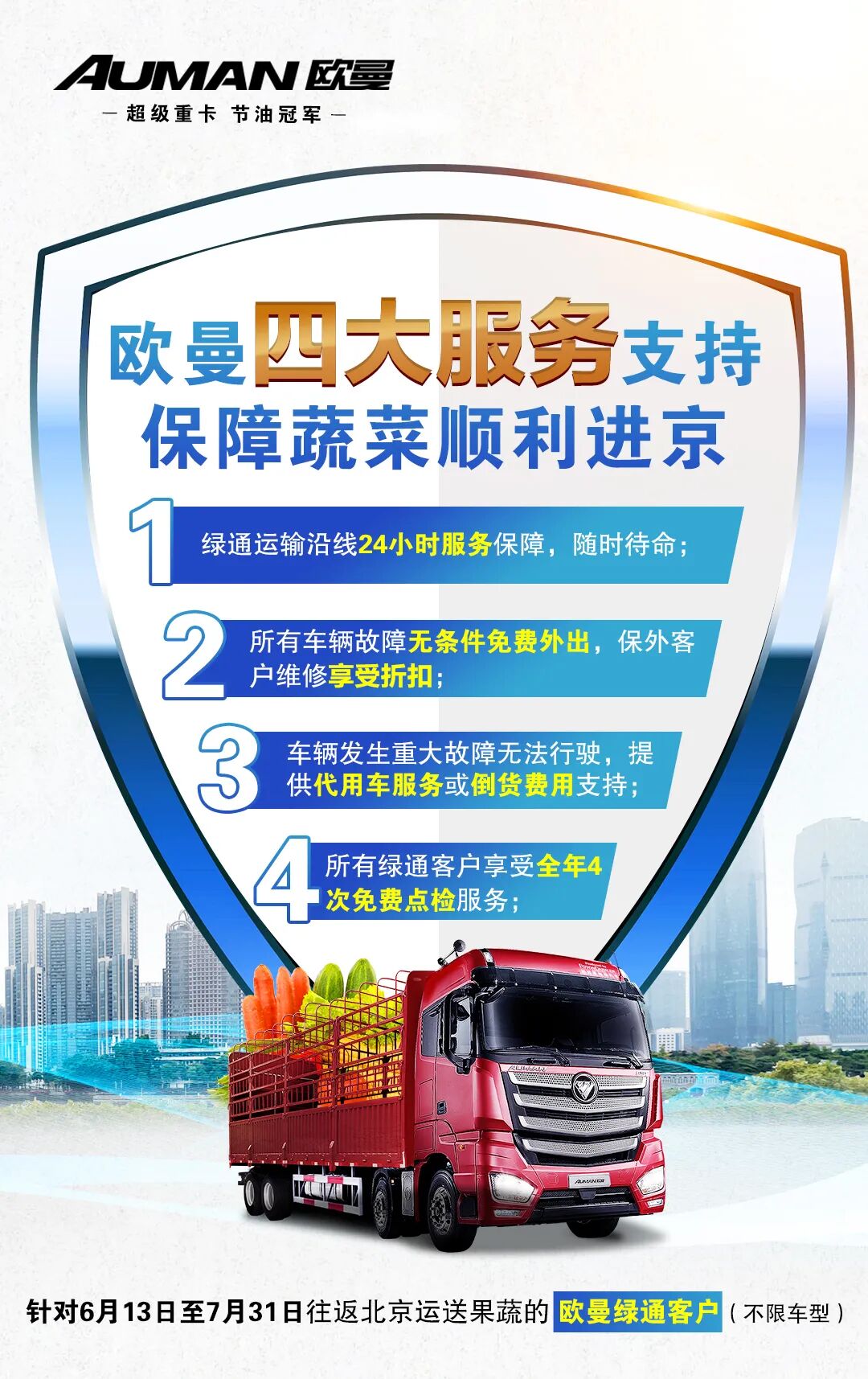 福田戴姆勒汽车针对6月13日至7月31日往返北京运送果蔬的绿通客户(不限车型)推出专属服务政策: