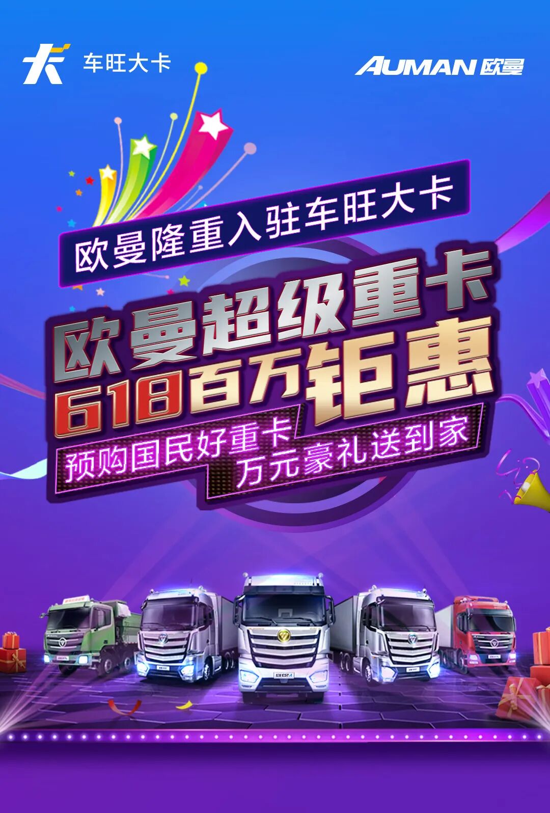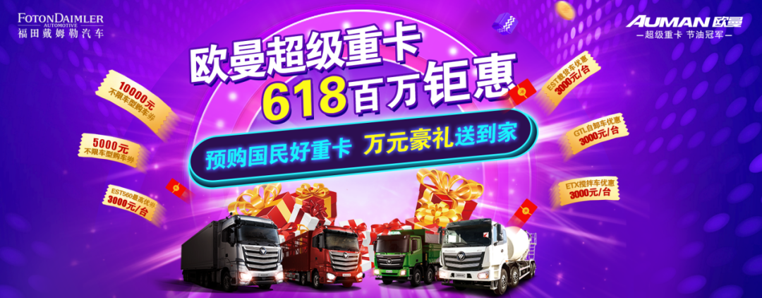 本次合作,双方将以618购物节为契机,为车旺大卡平台上的用户提供“欧曼超级重卡,618百万钜惠”的优惠购车活动:6.18元秒杀3000元购车款,万元购车款、维修保养券、机油、尿素等好礼相送的福利活动,对有购车需求的卡友们是一大利好。